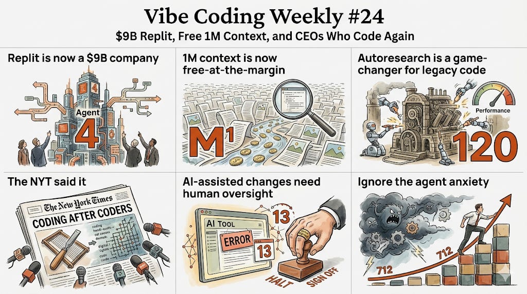 That’s a wrap for this week. The numbers tell one story — $400M raises, $9B valuations, 1M context at standard pricing. But the more interesting narrative is structural. Replit declared that the next frontier after autonomy is creativity. Anthropic declared that long context should be free. A CEO ran 120 automated experiments on a codebase he hasn’t touched in years. And the New York Times told 70+ developers’ stories to an audience that’s never heard of a coding agent.