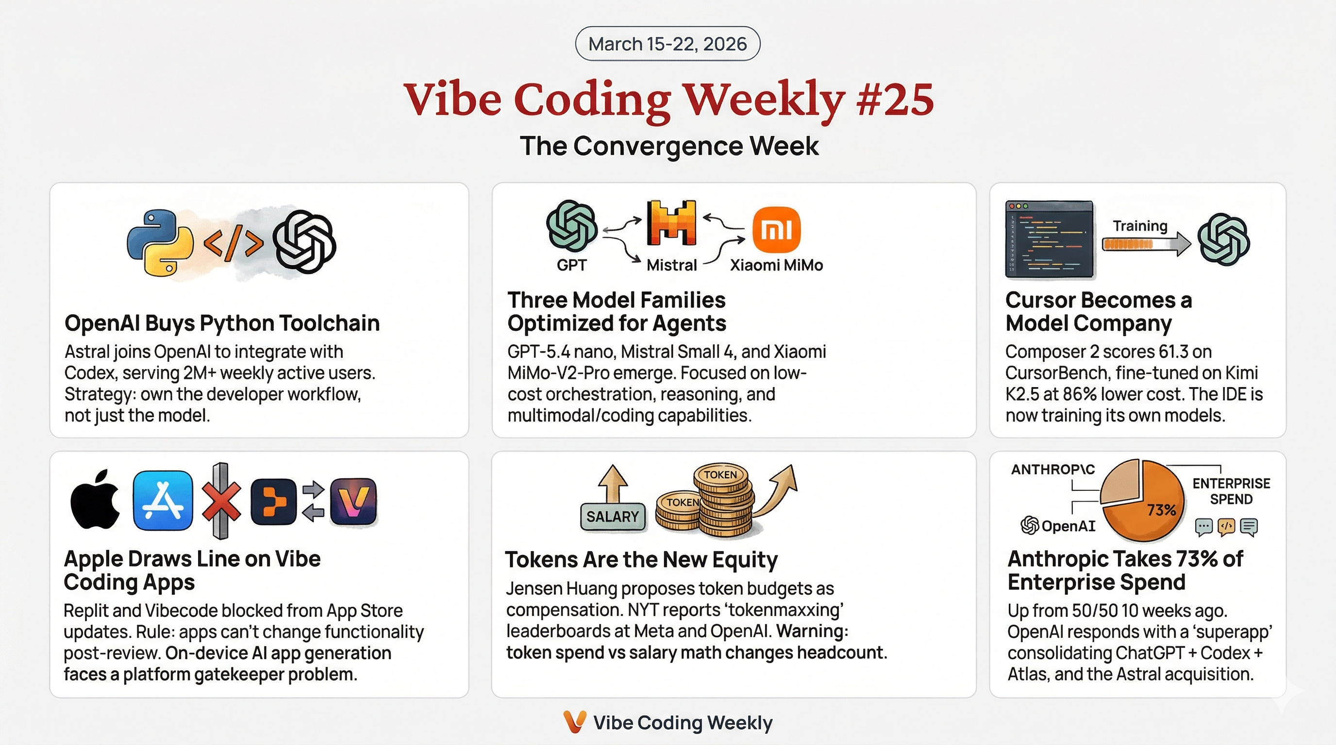 OpenAI announced it will acquire Astral, the company behind uv (package manager), Ruff (linter), and ty (type checker) — three open-source tools that have become foundational to modern Python development. The plan: integrate Astral’s tooling and engineering expertise directly into Codex, which now has over 2 million weekly active users and 5x usage growth since the start of the year. OpenAI commits to maintaining Astral’s open-source products post-acquisition. The strategic context is telling — with Anthropic capturing 73% of first-time enterprise AI spending (per Ramp/Axios data, up from 50/50 just ten weeks ago), OpenAI is shifting from model competition to developer workflow ownership.